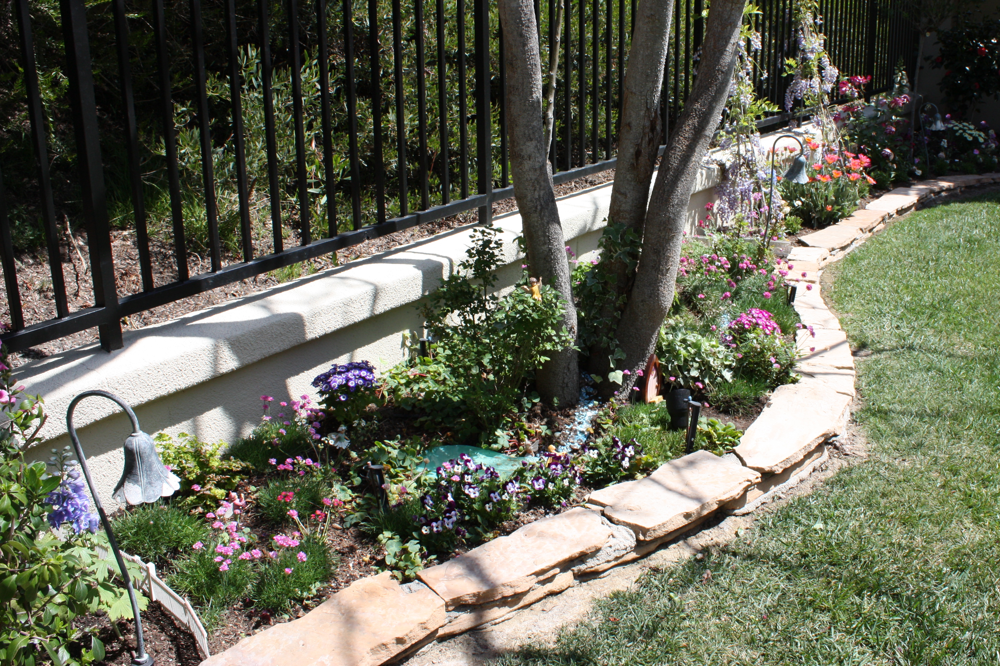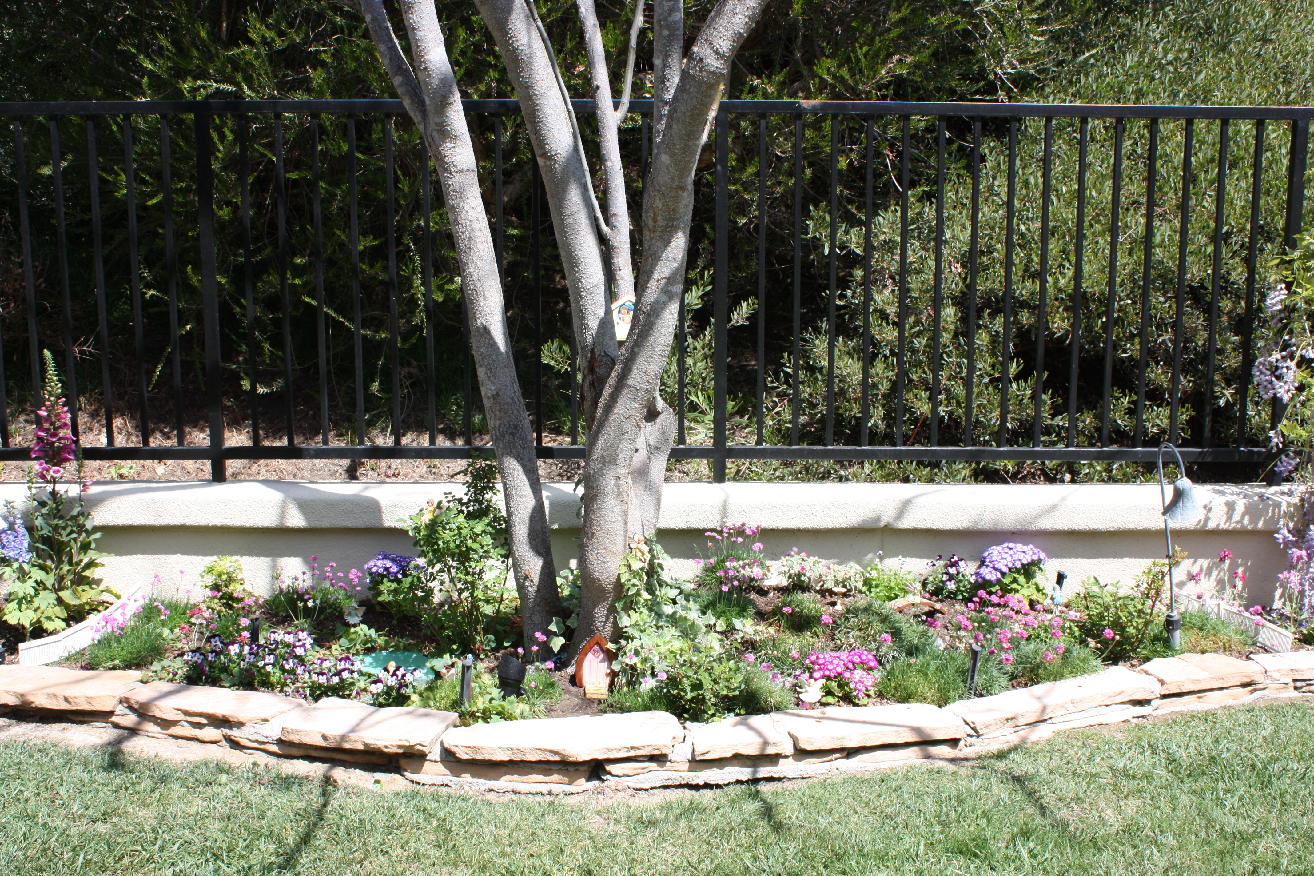 While most of the garden is flat, the tree in the middle provides some nice shade during the summer and a perfect home for the fairies.
